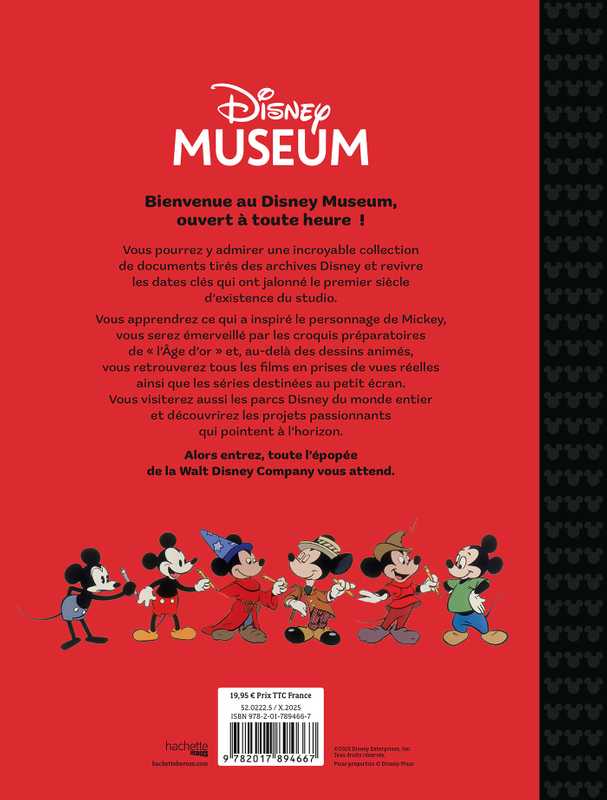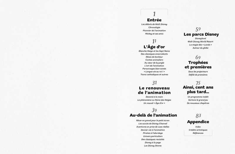Vous pourrez y admirer une incroyable collection de documents tirés des archives Disney et revivre les dates clés qui ont jalonné le premier siècle d’existence du studio. Vous apprendrez ce qui a inspiré le personnage de Mickey, vous serez émerveillé par les croquis préparatoires de « l’Âge d’or » et, au-delà des dessins animés, vous retrouverez tous les films en prises de vue réelles ainsi que les rêves destinés au petit écran. Vous visiterez aussi les parcs Disney du monde entier et découvrirez les projets passionnants qui pointent à l’horizon.