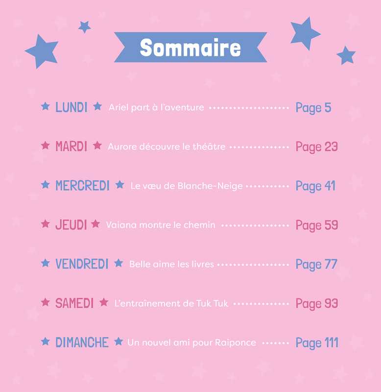 Contient les histoires : La Petite Sirène - Ariel part à l’aventure ; La Belle au Bois Dormant - Aurore découvre le théâtre ; Blanche-Neige et les Sept Nains - Le vœu de Blanche-Neige ; Vaiana -Vaiana montre le chemin ; La Belle et la Bête - Belle aime les livres ; Raya et le Dernier Dragon - L’entrainement de Tuk Tuk ; Raiponce - Un nouvel ami pour Raiponce