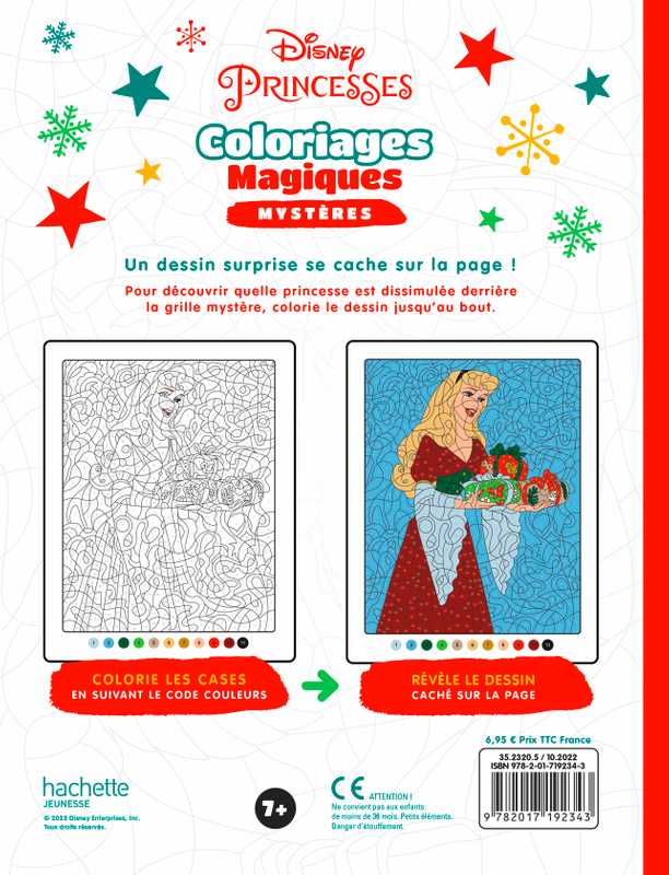 Dans chacune des 23 illustrations retravaillées se cache un dessin « surprise » ! Pour révéler l'illustration mystère sur chaque page et découvrir les princesses Disney, il suffit de colorier chaque zone de la grille selon le code couleurs indiqué !