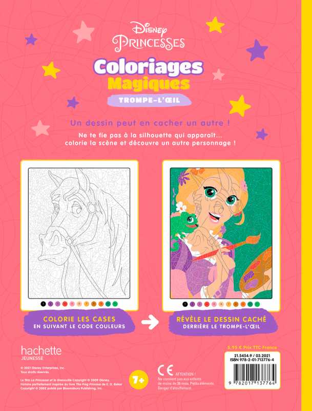 Dans chacune des 30 illustrations, un grand coloriage en « trompe-l’œil » à réaliser dans lesquels un personnage en cache un autre : l’enfant découvre une silhouette qui apparaît au crayon ; mais en coloriant la scène selon le code couleurs, il va découvrir une de ses Princesses Disney préférées !