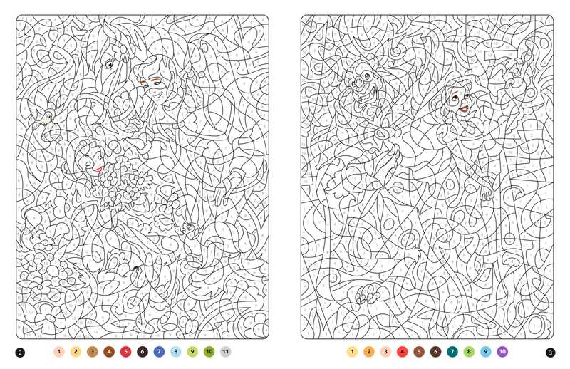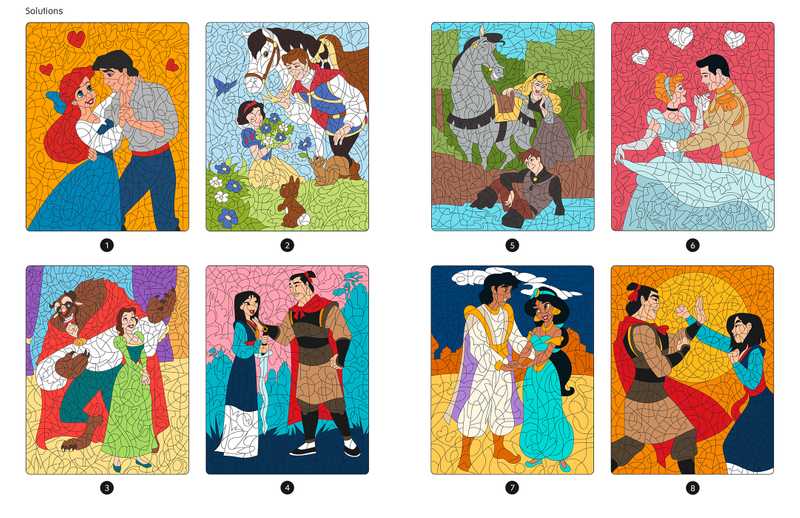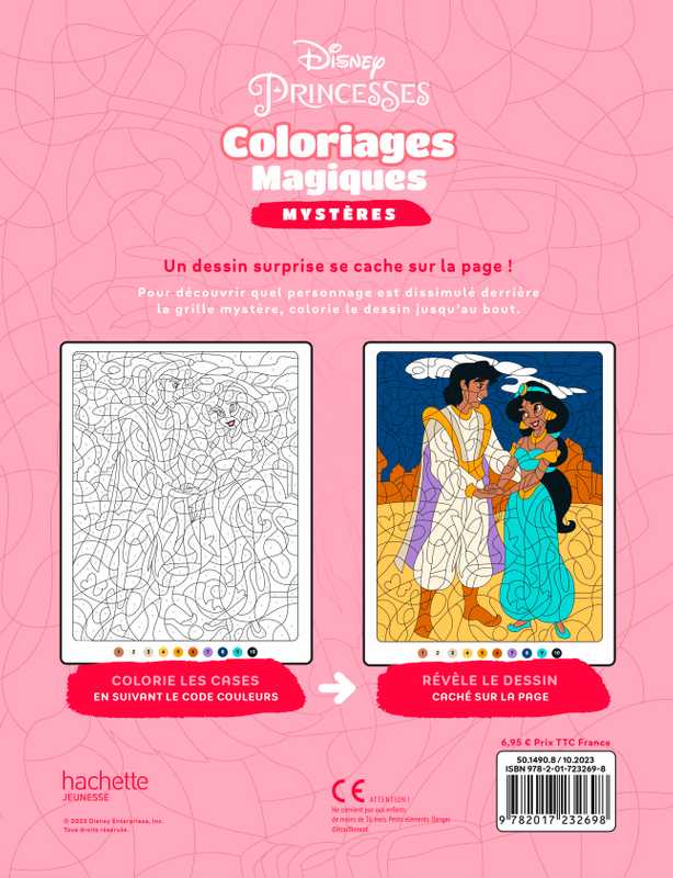 Pour révéler l'illustration mystère sur chaque page, il suffit de colorier chaque zone de la grille selon le code couleurs indiqué et découvrir les plus belles images romantiques des Princesses Disney et de leurs amoureux !