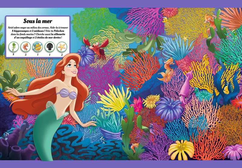 - Des illustrations qui fourmillent de détails pour s’amuser à retrouver les amis des princesses, mais aussi de nombreux éléments cachés dans les décors !