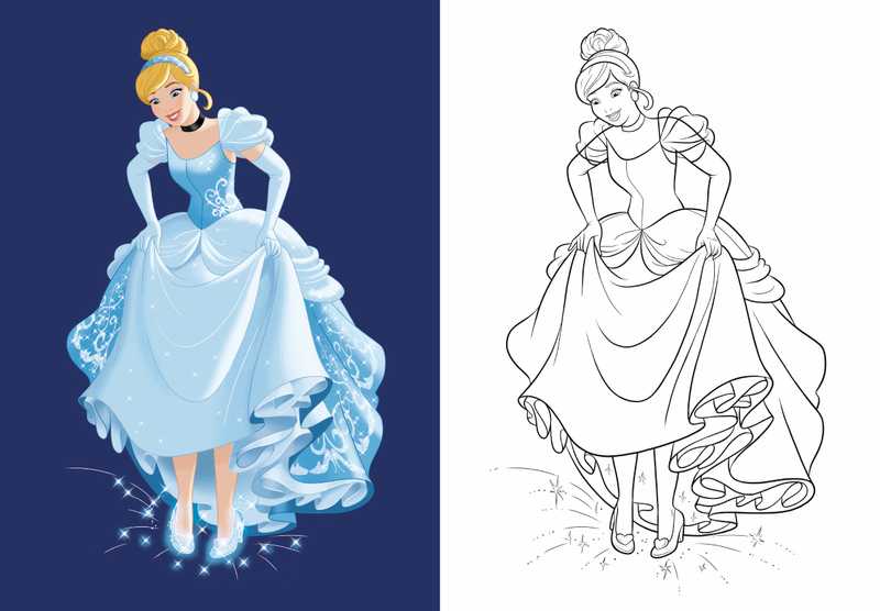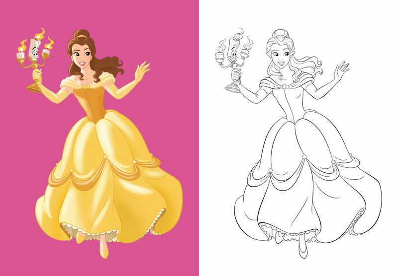 Un grand cahier de 60 coloriages des Princesses Disney (Cendrillon, Belle, Jasmine, etc.) : sur chaque double page, une grande illustration à colorier et en regard son modèle en couleurs.