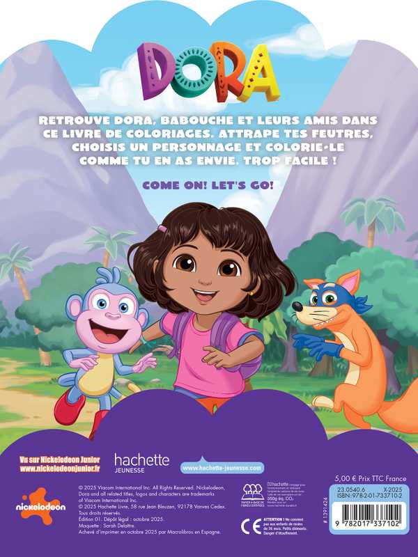 Retrouve Dora, Babouche et leurs amis dans ce livre de coloriages. Attrape tes feutres, choisis un personnage et colorie-le comme tu en as envie. Trop facile ! COME ON! LET'S GO!
