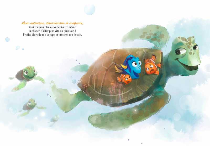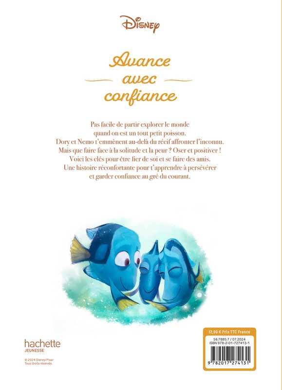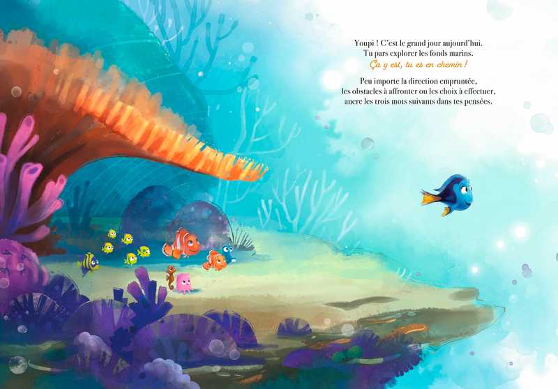 Résumé : Pas facile de partir explorer le monde quand on est un tout petit poisson. Dory et Nemo t'emmènent au-delà du récif affronter l'inconnu. Mais que faire face à la solitude et la peur ? Oser et positiver ! Voici les clés pour être fier de soi et se faire des amis. Une histoire réconfortante pour t'apprendre à persévérer et garder confiance au gré du courant.