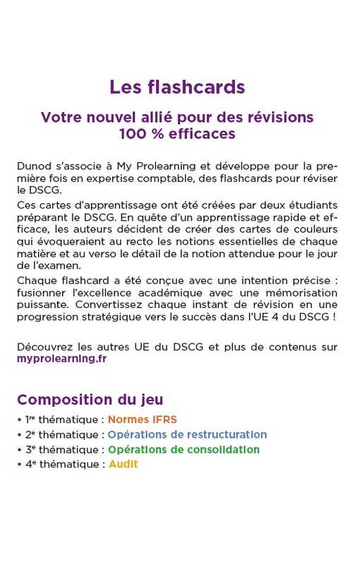 250 flashcards, organisées en thématiques et en couleurs, pour balayer l'ensemble du programme de l'UE 4 Comptabilité et Audit du DSCG.