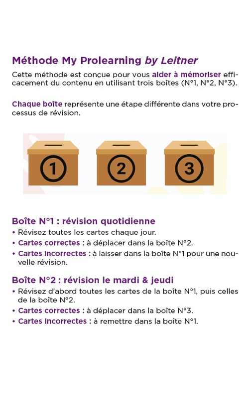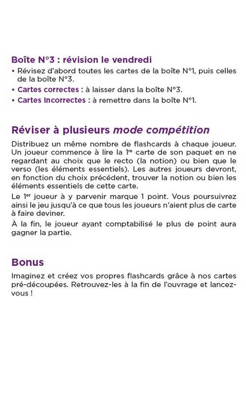 - Les flashcards, ouvrage qui permet de faciliter les révisions, d'accéder à plusieurs modes d'utilisation, tout en permettant d'activer l'efficacité de la mémorisation grâce aux neurosciences.