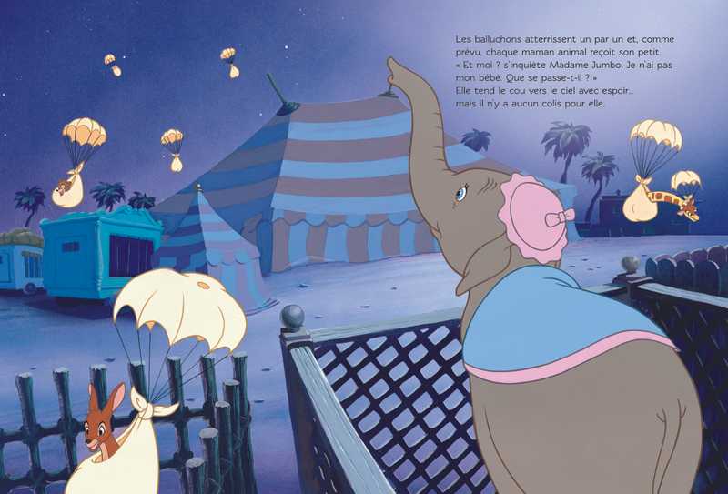 C’est le printemps et les cigognes apportent à chaque pensionnaire du grand cirque un colis. Madame Jumbo découvre un adorable petit éléphanteau… Mais avec de si grandes oreilles, il est la risée de tous ! Surnommé Dumbo, le petit éléphant doit faire face aux moqueries des autres animaux. Parviendra-t-il à faire de ses oreilles un atout ?