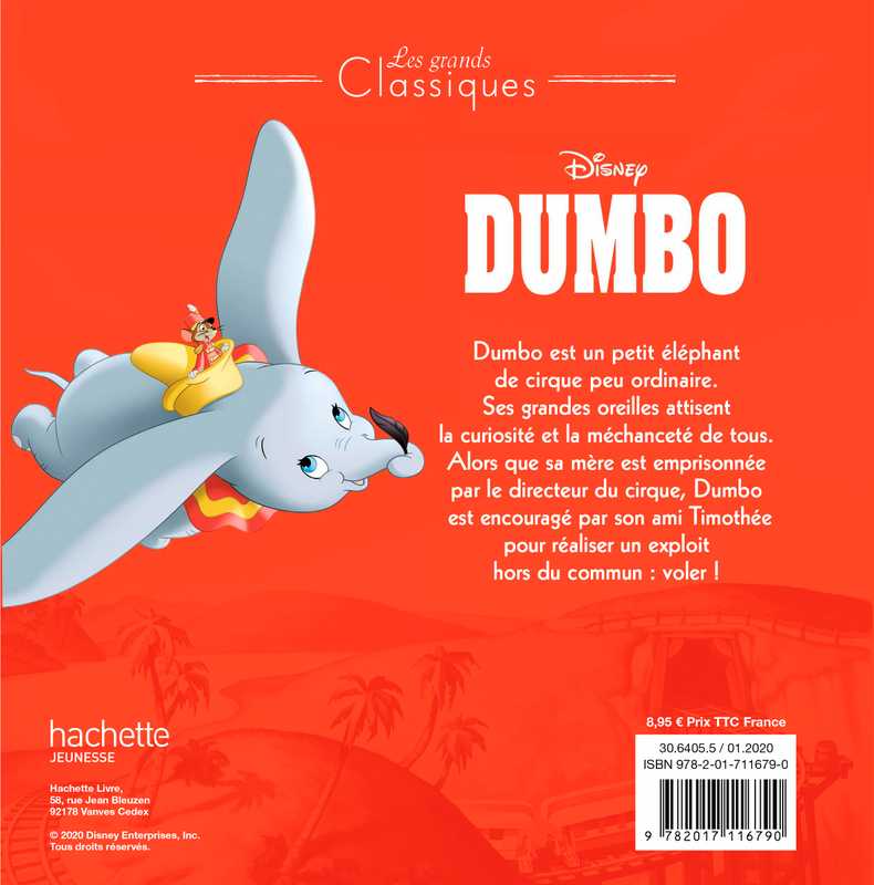 Histoire : Dumbo est un petit éléphant de cirque peu ordinaire. Ses grandes oreilles attisent la curiosité et la méchanceté de tous. Alors que sa mère est emprisonnée par le directeur du cirque, Dumbo est encouragé par son ami Timothée pour réaliser un exploit : voler !