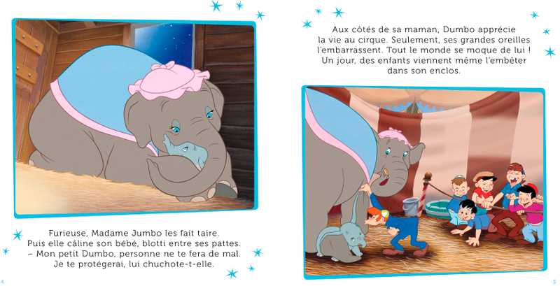 L’histoire : Une cigogne a livré un nouveau-né à Madame Jumbo, la femelle éléphant pensionnaire du cirque. Dumbo est un adorable éléphanteau aux oreilles immenses ! Mais bientôt, le petit éléphant doit faire face aux moqueries des animaux et des humains. Parviendra-t-il à faire de ses oreilles un atout ?