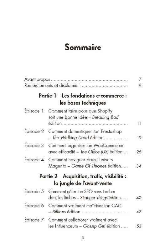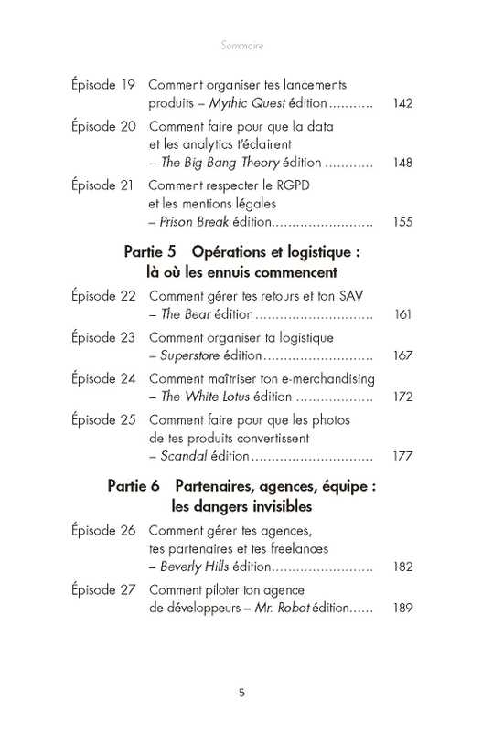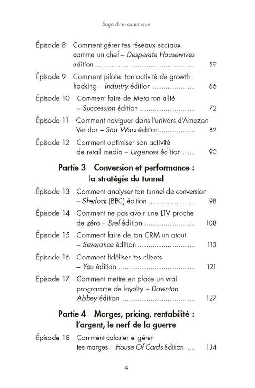 Ce livre constitue un outil précieux sur le e-commerce pour tous ceux qui sont à la recherche de conseils et de points de repère. C'est à la fois un guide stratégique, et le retour d'expérience et les astuces d'une professionnelle du e-commerce. Chaque chapitre commence par un parallèle entre une série (Sherlock, Star Wars, Severance, etc.) et une situation rencontrée lorsque l'on travaille dans le e-commerce.