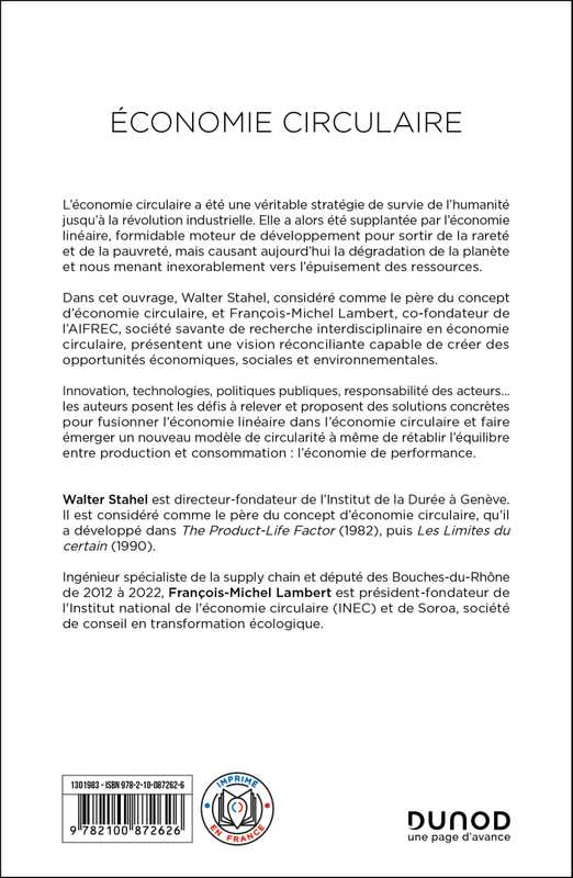 Dans cet ouvrage, Walter Stahel, considéré comme le père du concept d’économie circulaire, et François-Michel Lambert, co-fondateur de l’AIFREC, société savante de recherche interdisciplinaire en économie circulaire, présentent une vision réconciliante capable de créer des opportunités économiques, sociales et environnementales.