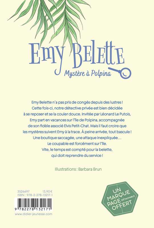 Emy Belette n’a pas pris de congés depuis des lustres ! Cette fois-ci, notre détective privée est bien décidée à se reposer et se la couler douce. Invitée par Léonard Le Putois, Emy part en vacances sur l’île de Polpina, accompagnée de son fidèle associé Elvis Petit-Chat. Mais il faut croire que les mystères suivent Emy à la trace. À peine arrivée, tout bascule ! Une boutique saccagée, une attaque inexpliquée… Le coupable est forcément sur l’île. Vite, le temps est compté pour la belette, qui doit reprendre du service !