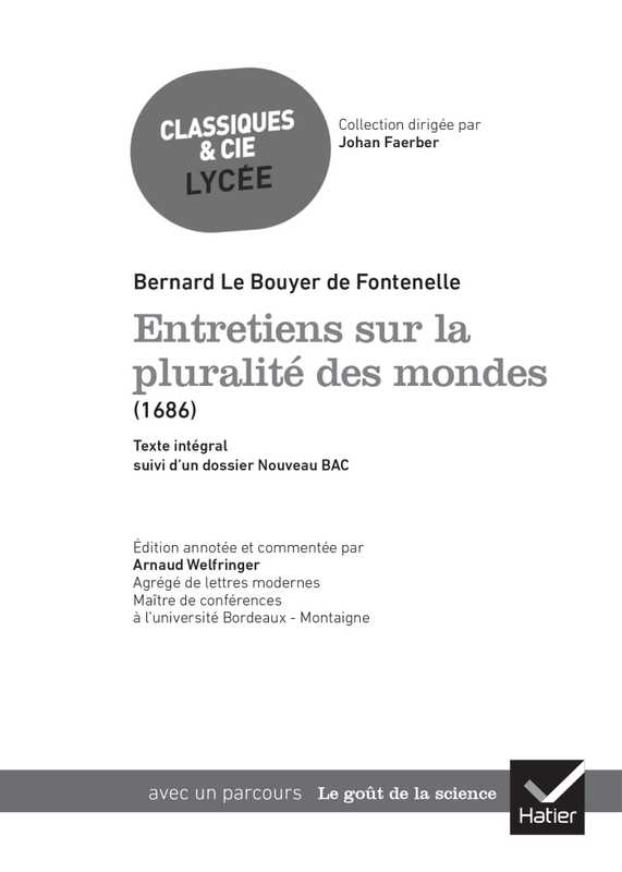 Le dialogue Entretiens sur la pluralité des mondes, au programme des 1re générale et technologique, suivi du parcours littéraire « Le goût de la science ». Dans une édition spéciale bac de français pour faciliter la préparation à l’épreuve.