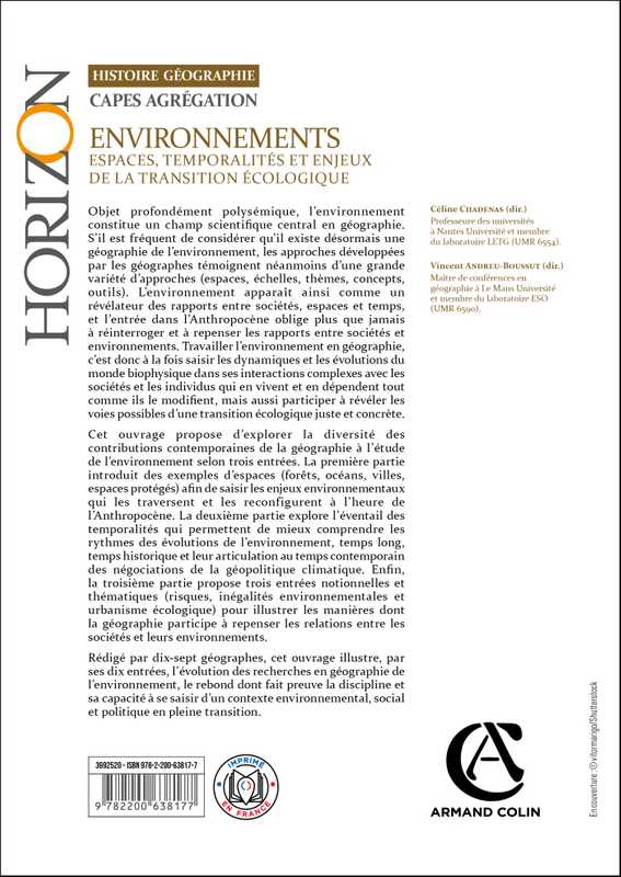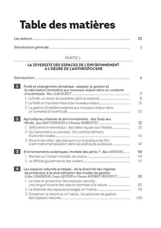 Cet ouvrage propose d’explorer la diversité des contributions contemporaines de la géographie à l’étude de l’environnement selon trois entrées. La première partie introduit des exemples d’espaces (forêts, océans, villes, espaces protégés) afin de saisir les enjeux environnementaux qui les traversent et les reconfigurent à l’heure de l’Anthropocène. La deuxième partie explore l’éventail des temporalités qui permettent de mieux comprendre les rythmes des évolutions de l’environnement, temps long, temps historique et leur articulation au temps contemporain des négociations de la géopolitique climatique. Enfin, la troisième partie propose trois entrées notionnelles et thématiques (risques, inégalités environnementales et urbanisme écologique) pour illustrer les manières dont la géographie participe à repenser les relations entre les sociétés et leurs environnements.