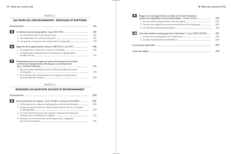 Rédigé par dix-sept géographes, cet ouvrage illustre, par ses dix entrées, l’évolution des recherches en géographie de l’environnement, le rebond dont fait preuve la discipline et sa capacité à se saisir d’un contexte environnemental, social et politique en pleine transition.