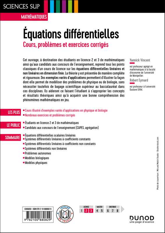 Cet ouvrage, à destination des étudiants en Licence 2 et 3 de mathématiques ainsi qu’aux candidats aux concours de l’enseignement, reprend tous les points classiques d’un cours de Licence sur les équations différentielles linéaires et non linéaires en dimension finie. La théorie y est présentée de manière complète et rigoureuse. Des exemples variés d’applications permettent d’illustrer la façon dont la théorie permet de modéliser des problèmes liés à la physique et à la biologie sans nécessiter toutefois de bagage scientifique supérieur au baccalauréat dans ces disciplines. Ils aident ainsi l’étudiant à s’approprier les concepts et résultats théoriques et à acquérir une bonne compréhension des phénomènes mathématiques en jeu.