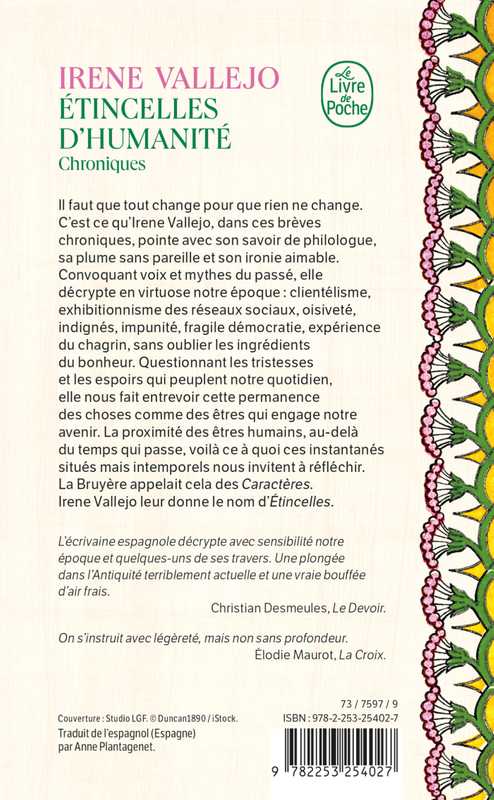 Il faut que tout change pour que rien ne change. C’est ce qu’Irene Vallejo, dans ces brèves chroniques, pointe avec son savoir de philologue, sa plume sans pareille et son ironie aimable. Convoquant voix et mythes du passé, elle décrypte en virtuose notre époque : clientélisme, exhibitionnisme des réseaux sociaux, oisiveté, indignés, impunité, fragile démocratie, expérience du chagrin, sans oublier les ingrédients du bonheur. Questionnant les tristesses et les espoirs qui peuplent notre quotidien, elle nous fait entrevoir cette permanence des choses comme des êtres qui engage notre avenir. La proximité des êtres humains, au-delà du temps qui passe, voilà ce à quoi ces instantanés situés mais intemporels nous invitent à réfléchir. La Bruyère appelait cela des Caractères. Irene Vallejo leur donne le nom d’Étincelles.