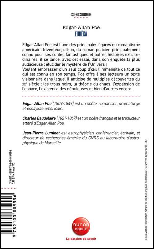 Edgar Allan Poe est l'une des principales figures du romantisme américain. Inventeur, dit-on, du roman policier, principalement connu pour ses contes fantastiques et autres histoires extraordinaires, il se lance, avec cet essai, dans son enquête la plus audacieuse : élucider le mystère de l'Univers !