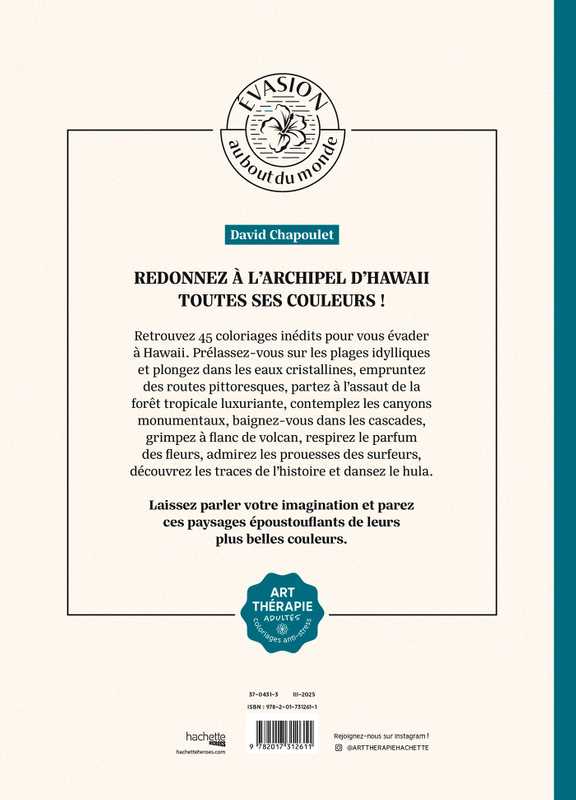 Retrouvez 45 coloriages inédits pour vous évader à Hawaii. Prélassez-vous sur les plages idylliques et plongez dans les eaux cristallines, empruntez des routes pittoresques, partez à l'assaut de la forêt tropicale luxuriante, contemplez les canyons monumentaux, baignez-vous dans les cascades, grimpez à flanc de volcan, respirez le parfum des fleurs, admirez les prouesses des surfeurs, découvrez les traces de l'histoire et dansez le hula.