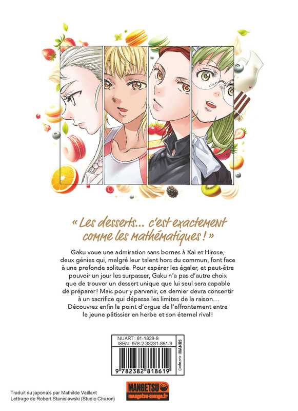Gaku voue une admiration sans bornes à Kai et Hirose, deux génies qui, malgré leur talent hors du commun, font face à une profonde solitude. Pour espérer les égaler, et peut-être pouvoir un jour les surpasser, Gaku n'a pas d'autre choix que de trouver un dessert unique que lui seul sera capable de préparer ! Mais pour y parvenir, ce dernier devra consentir à un sacrifice qui dépasse les limites de la raison... Découvrez enfin le point d'orgue de l'affrontement entre le jeune pâtissier en herbe et son éternel rival !