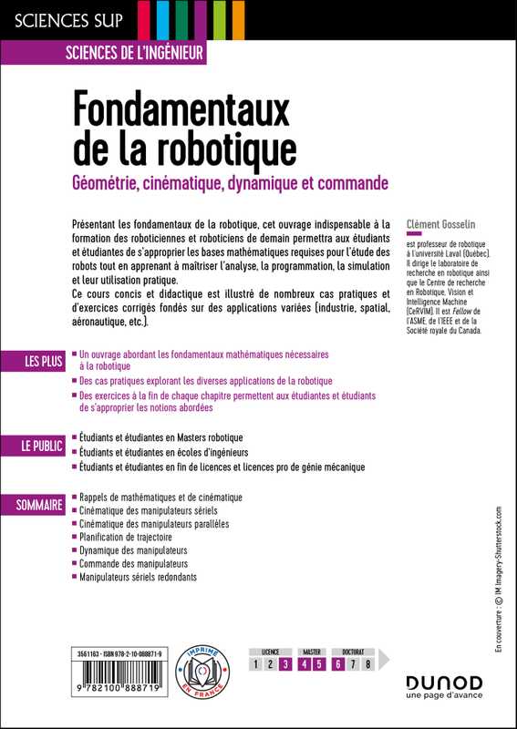 Présentant les fondamentaux de la robotique, cet ouvrage indispensable à la formation des roboticiennes et roboticiens de demain permettra aux étudiants et étudiantes de s’approprier les bases mathématiques requises pour l’étude des robots tout en apprenant à maîtriser l’analyse, la programmation, la simulation et leur utilisation pratique.