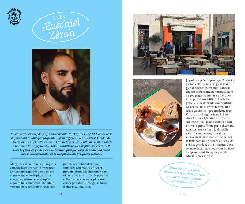 Marseillais et vivant à Marseille, Ezéchiel Zérah a sélectionné près de 200 adresses soigneusement testées et validées : bistrots de quartier, pizzerias, bars où prendre l’apéro, tables les pieds dans l’eau, épiceries authentiques de Noailles, coffee shops et bien plus encore. Au-delà des lieux, il met aussi en lumière des expériences gourmandes qui racontent la ville autrement.