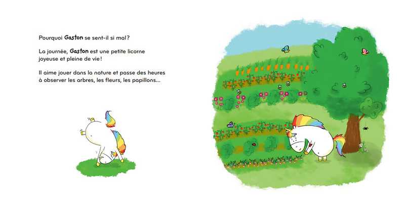 Gaston est une petite licorne différente des autres. Il a une particularité : sa crinière lorsqu'il va bien sa crinière a les couleurs de l’arc-en-ciel, mais dès qu'une émotion forte le submerge, elle change de couleur selon son humeur.