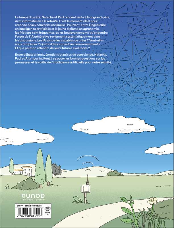 Le temps d’un été, Natacha et Paul rendent visite à leur grand-père Arix, récemment veuf. Arix a travaillé toute sa vie dans l’informatique, et notamment dans l’intelligence artificielle, suivant de près, des années 1970 à 2010, les évolutions des technologies déterministes puis prédictives. Natacha, sa petite-fille, a plongé tête baissée dans la dernière génération d’IA dite générative, quand Paul, à l’inverse, a préféré mettre de côté les technologies pour s’intéresser à la permaculture. Alors que leur mère, artiste peintre, a perdu un appel d’offres face à une IA, Natacha, Paul et Arix se lancent dans un débat passionné sur les enjeux et les risques de cette révolution, qui bouleverse déjà notre quotidien.