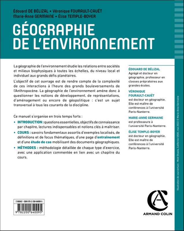 La géographie de l’environnement étudie les relations entre sociétés et milieux biophysiques à toutes les échelles, du niveau local et individuel aux grands défis planétaires. L’objectif de cet ouvrage est de rendre compte de la complexité de ces interactions : exploitation des ressources naturelles, gestion des risques, protection de l’environnement, etc. La géographie de l’environnement amène donc à questionner les notions de développement, de représentations, d’aménagement ou encore de géopolitique : c’est un sujet transversal à tous les courants de la discipline.