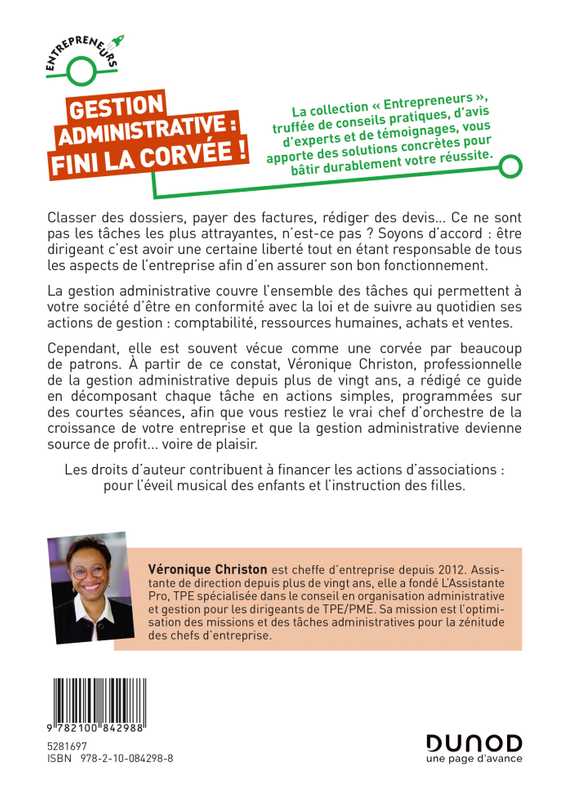 À partir de ce constat, Véronique Christon, professionnelle de la gestion administrative depuis plus de vingt ans, a rédigé ce guide en décomposant chaque tâche en actions simples, programmées sur des courtes séances, afin que vous restiez le vrai chef d’orchestre de la croissance de votre entreprise et que la gestion administrative devienne source de profit... voire de plaisir.