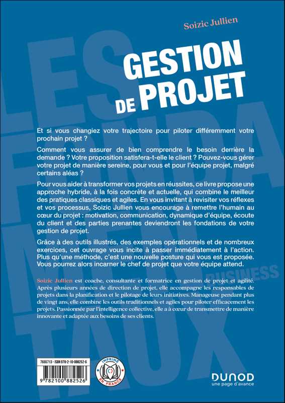 Pour vous aider à transformer vos projets en réussites, ce livre propose une approche hybride, à la fois concrète et actuelle, qui combine le meilleur des pratiques classiques et agiles. En vous invitant à revisiter vos réflexes et vos processus, Soizic Jullien vous encourage à remettre l’humain au cœur du projet : motivation, communication, dynamique d’équipe, écoute du client et des parties prenantes deviendront les fondations de votre gestion de projet.