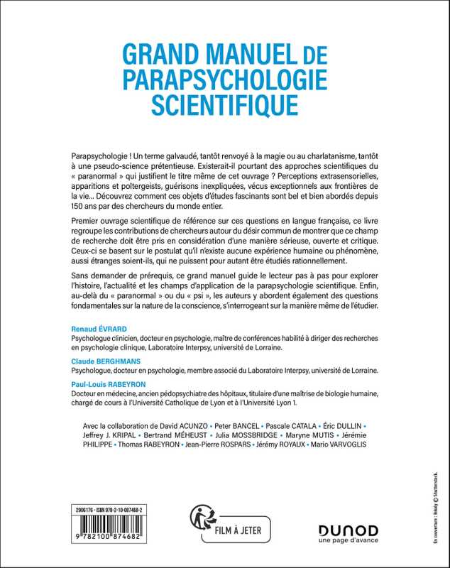 C'est à partir de ce constat et dans le but de développer cette discipline en France qu'est né le projet de cet ouvrage, qui présente les différentes dimensions et champs d'application de la parapsychologie conçus sur une base transdisciplinaire, en faisant intervenir une quinzaine de chercheurs universitaires et experts internationaux.