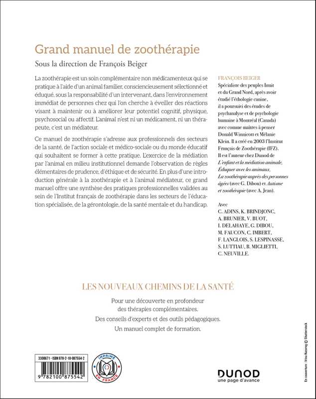 Ce manuel de zoothérapie s’adresse aux professionnels des secteurs de la santé, de l’action sociale et médico-sociale ou du monde éducatif qui souhaitent se former à cette pratique. L'exercice de la médiation par l'animal en milieu institutionnel demande l'observation de règles élémentaires de prudence, d'éthique et de sécurité. En plus d’une introduction générale à la zoothérapie et à l’animal médiateur, il offre une synthèse des pratiques professionnelles validées au sein de l’Institut français de zoothérapie dans les secteurs de l’éducation spécialisée, de la gérontologie, de la santé mentale et du handicap.