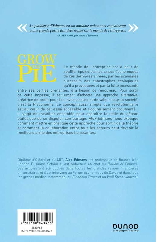 Le monde de l’entreprise est à bout de souffle. Épuisé par les crises économiques de ces dernières années, par les scandales successifs des catastrophes écologiques qu’il a provoquées et par la lutte incessante entre ses parties prenantes, il a besoin de renouveau. Pour sortir de cette impasse, il est urgent d’adopter une approche alternative, créatrice de profit pour les investisseurs et de valeur pour la société, c’est la Pieconomie. Ce concept aussi simple que révolutionnaire est au cœur de cet essai accessible et rigoureusement documenté : il s’agit de travailler ensemble pour accroître la taille du gâteau plutôt que de se disputer son partage. Alex Edmans nous explique comment mettre en pratique cette approche pour sortir de la théorie et comment la collaboration entre tous les acteurs peut devenir la meilleure arme des entreprises florissantes.