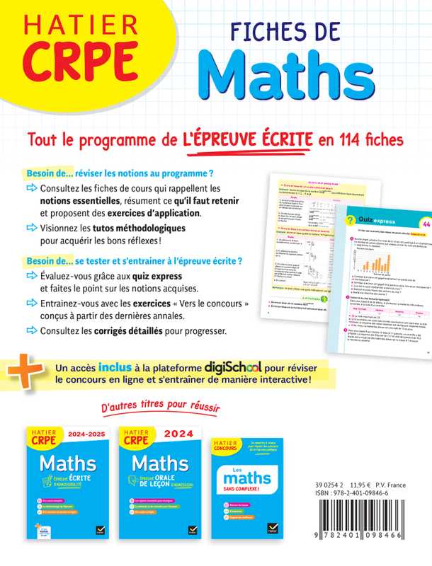 Un ouvrage pratique constitué de 114 fiches de cours, quiz et "vers le concours" pour réussir l'épreuve disciplinaire écrite de Maths autour des thématiques au programme: Nombres et calculs, Organisation et gestion de données – Fonction, Grandeur et mesure, Espace et Géométrie, Algorithmique et programmation.