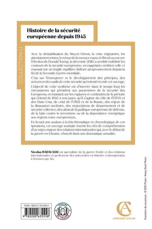 C’est sur l’émergence et le développement des principes, des acteurs et des outils de cette sécurité qu’entend revenir cet ouvrage. L’objectif de cette synthèse est d’inscrire dans le temps long les mécanismes qui président aux paramètres de la sécurité des Européens, en insistant sur les ruptures et continuités de la période qui s’étend de 1945 à nos jours, qu’il s’agisse du rôle de l’OTAN et des États-Unis, de celui de l’URSS et de la Russie, des enjeux de la dissuasion nucléaire, des négociations de désarmement et de sécurité collective, des aléas de la politique européenne de défense, de la lutte contre le terrorisme ou de la dépendance énergétique aux régions extra-européennes.