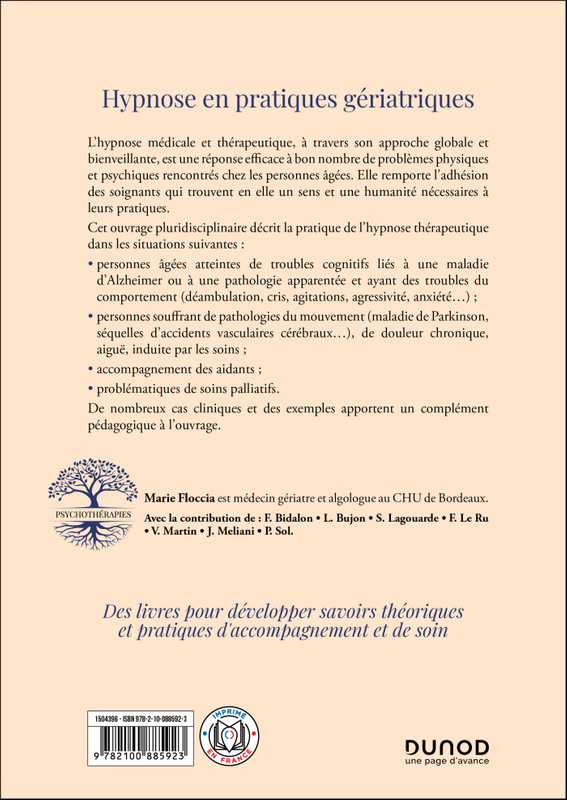 La réponse médicamenteuse reste souvent la première réponse des médecins face aux divers inconforts et pathologies chez les personnes âgées, ce qui s’avère souvent insuffisant, voire nocif. En revanche, l’hypnose permet d’apaiser et de soigner les patients, avec des techniques très satisfaisantes pour les soignants. Elle a une efficacité prouvée sur nombre de problèmes physiques et psychiques spécifiques au grand âge. Cet ouvrage en expose la pratique chez les patients atteints de troubles cognitifs (légers, modérés, sévères) et/ou de troubles du comportement qui peuvent y être associés (déambulation, cris, agitations, agressivité, anxiété…) et des spécificités des lieux d’intervention (domicile, EHPAD, urgences…). Il détaille aussi la prise en charge de la douleur chronique, aiguë et induite (soins de plaies, ponctions veineuses, toilettes, mobilisations…), la maladie de Parkinson et la fin de vie. De nombreux cas cliniques illustrent le propos