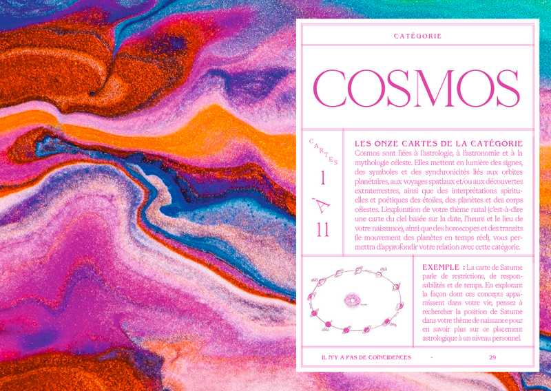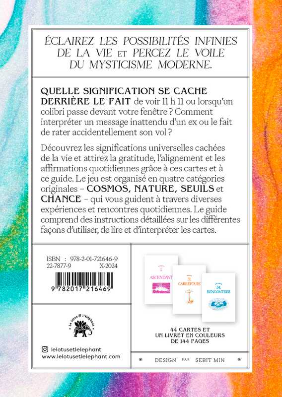 Découvrez les significations universelles cachées de la vie et attirez la gratitude, l'alignement et les affirmations quotidiennes grâce à ces cartes et à ce guide. Le jeu est organisé en quatre catégories originales - COSMOS, NATURE, SEUILS et CHANCE - qui vous guident à travers diverses expériences et rencontres quotidiennes. Le guide comprend des instructions détaillées sur les différentes façons d'utiliser, de lire et d'interpréter les cartes.