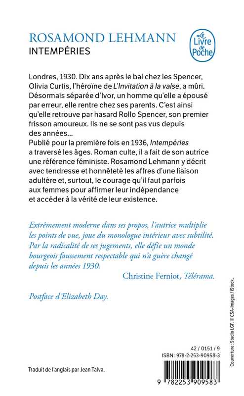 Publié pour la première fois en 1936, Intempéries a traversé les âges. Roman culte, il a fait de son autrice une référence féministe. Rosamond Lehmann y décrit avec tendresse et honnêteté les affres d’une liaison adultère et, surtout, le courage qu’il faut parfois aux femmes pour affirmer leur indépendance et accéder à la vérité de leur existence.