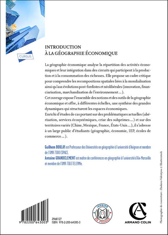 Assorti d’études de cas portant sur des sujets concrets (ubérisation, services écosystémiques, subprimes…) et des territoires variés (Chine, Mexique, France, États-Unis…), il s’adresse à un large public d’étudiants (géographes, économistes, IEP, écoles de commerce…).