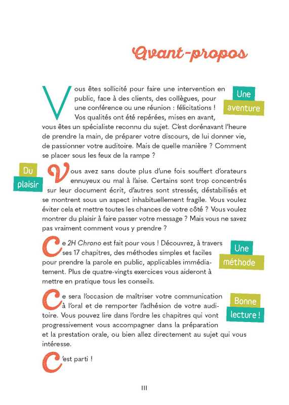 Encore un livre sur la prise de parole en public ? oui mais la collection 2H Chrono se démarque par son style ludique qui interpelle le lecteur, ses nombreux exercices et da charte graphique aux visuels forts. Elle donne un ton original au sujet déjà largement abordé.