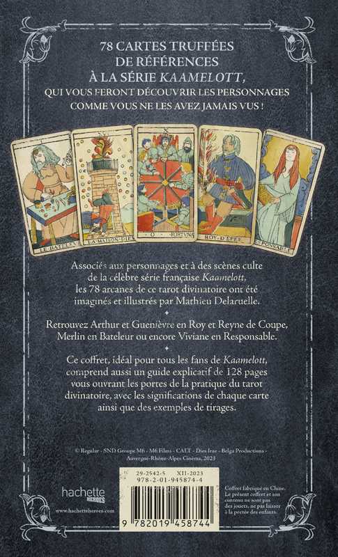 Ce coffret, idéal pour tous les fans de Kaamelott, comprend aussi un guide explicatif de 128 pages vous ouvrant les portes de la pratique du tarot divinatoire, avec les significations de chaque carte ainsi que des exemples de tirages.