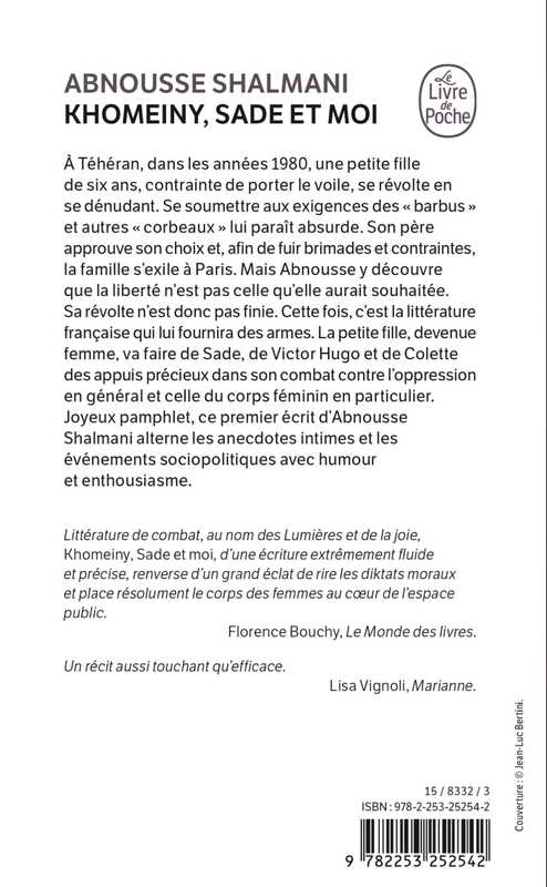 À Téhéran, dans les années 1980, une petite fille de six ans, contrainte de porter le voile, se révolte en se dénudant. Se soumettre aux exigences des « barbus » et autres « corbeaux » lui paraît absurde. Son père approuve son choix et, afin de fuir brimades et contraintes, la famille s’exile à Paris. Mais Abnousse y découvre que la liberté n’est pas celle qu’elle aurait souhaitée. Sa révolte n’est donc pas finie. Cette fois, c’est la littérature française qui lui fournira des armes. La petite fille, devenue femme, va faire de Sade, de Victor Hugo et de Colette des appuis précieux dans son combat contre l’oppression en général et celle du corps féminin en particulier.