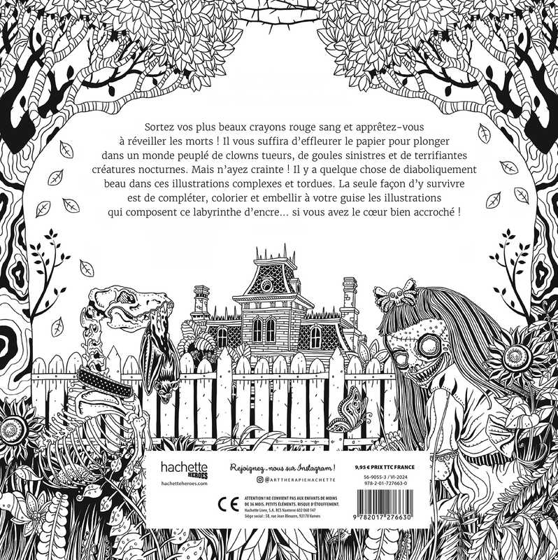 Sortez vos plus beaux crayons rouge sang et apprêtez-vous à réveiller les morts ! Il vous suffira d'effleurer le papier pour plonger dans un moonde peuplé de clowns tueurs, de goules sinistres et de terrifiantes créatures nocturnes...Mais n'ayez crainte ! Il y a quelque chose de diaboliquement beau dans ces illustrations complexes et tordues. La seule façon d'y survivre est de compléter, colorier et embellir à votre guise les illustrations qui composent ce labyrinthe d'encre...Si vous avez le coeur bien accroché !