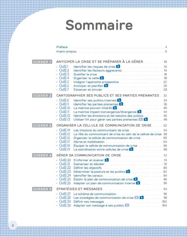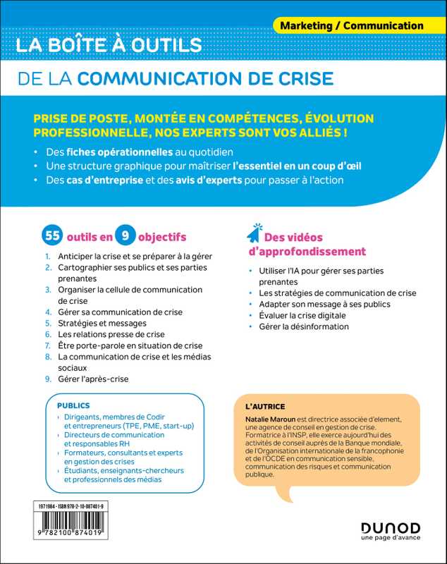 Destiné autant aux personnes expérimentées souhaitant une méthodologie pour conforter leur pratique, aux communicants (du service public ou des organisations privées) et consultants en communication, ainsi qu’aux chefs de petites entreprises, l’ouvrage balaie les grandes étapes du process de communication de crise allant de la préparation à la reconstruction en passant par la réponse.