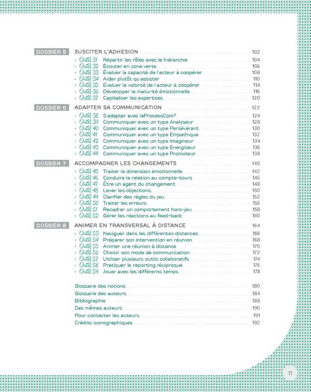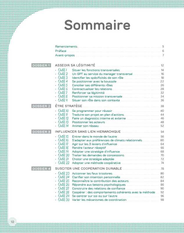 1. Asseoir sa légitimité. 2. Être stratège. 3. Influencer sans lien hiérarchique. 4. Susciter une coopération durable. 5. Susciter l’adhésion. 6. Adapter sa communication. 7. Accompagner les changements. 8. Animer en transversal à distance