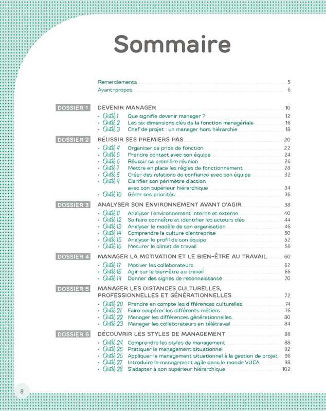 Ce livre a pour objectif, en 59 outils, d’aider les nouveaux managers à prendre leurs nouvelles responsabilités de manière éclairée et sereine, en leur expliquant les pièges à éviter et les bonnes attitudes à adopter pour réussir les premières années de leur vie de manager. Cet ouvrage est un véritable guide opérationnel qui les aide à bien comprendre l’environnement dans lequel ils évoluent et à bien se positionner vis-à-vis de leur équipe et de leur hiérarchie.