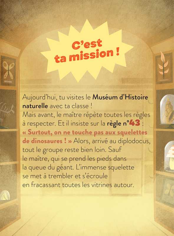 La visite au Muséum d’Histoire naturelle avec ta classe a dégénéré : ton maître a touché un squelette de diplodocus ! Et qui doit le sauver ? C’est toi, bien sûr ! Grâce à ta combinaison spéciale, te voilà projeté(e) dans toutes sortes d’univers où tu croiseras des dinosaures, des animaux disparus et même des météorites. À toi de jouer !