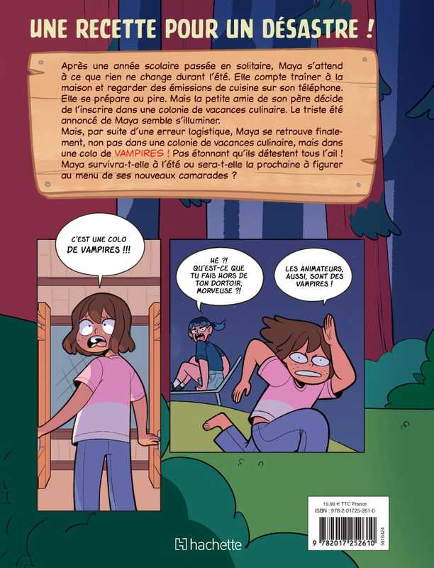 Mais, par suite d’une erreur logistique, Maya se retrouve finalement, non pas dans une colonie de vacances culinaire, mais dans une colo de VAMPIRES ! Pas étonnant qu’ils détestent tous l’ail ! Maya survivra-t elle à l’été ou sera-t-elle la prochaine à fi gurer au menu de ses nouveaux camarades ?